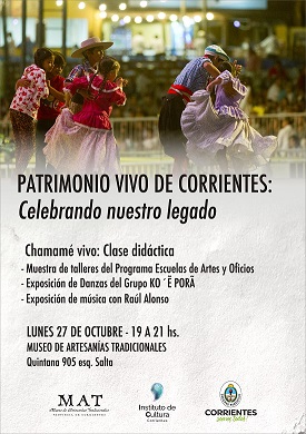 Bajo el nombre “Chamamé Vivo: Clase Didáctica”, la actividad se realizará el lunes 27 de octubre, de 19:00 a 21:00 horas, en la sede del Museo de Artesanías Tradicionales (MAT) ubicado en Quintana 905.